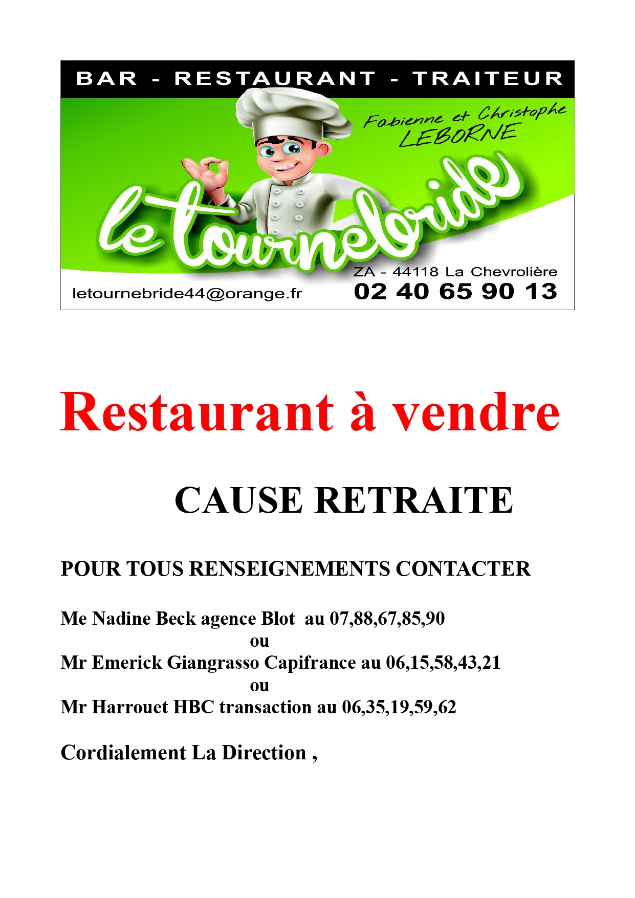 Vente restaurant Le Tournebride